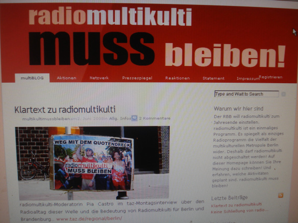 Radio Multikulti macht das Leben vieler Menschen in dieser Stadt einfacher, weil es sie dabei unterstützt, sich mit Deutschland zu identifizieren. Radio Multikulti ist ein Bekenntnis zur Vielfalt, ohne dass in den Programmen romantische oder kitschige Vorstellungen vom Fremden, vom Anderen bedient werden. Und wir geben Menschen in Berlin, die sonst weniger Chancen haben, weil sie nicht perfekt Deutsch sprechen, eine Plattform. Das hat vielen Leuten viel Mut gemacht. Man fühlt sich doch verbunden mit diesem Land, wenn man etwas schafft und es zeigen darf. Wer Radio Multikulti hört, identifiziert sich mit diesen Facetten Berlins. Auch unsere deutschen Zuhörer. Das ist Integration….“ Das w a r Integration. Was jetzt aber folgt, ist Ausgrenzung. Ist Beleg, für wie beliebig und austauschbar Rundfunkverantwortliche wie die zuständige RBB-Intendantin halten, was auf dieser Frequenz gesendet wird. Dagmar Reim und ihre Berater haben eine typische Stammtischentscheidung getroffen: Ausländer raus! Das Winken mit dem WDR-Ersatzprogramm belegt nur um so deutlicher, wie wenig verteidigenswert sie hält, was hier als Vorzeigeprojekt lebendiger Kultur entstanden ist