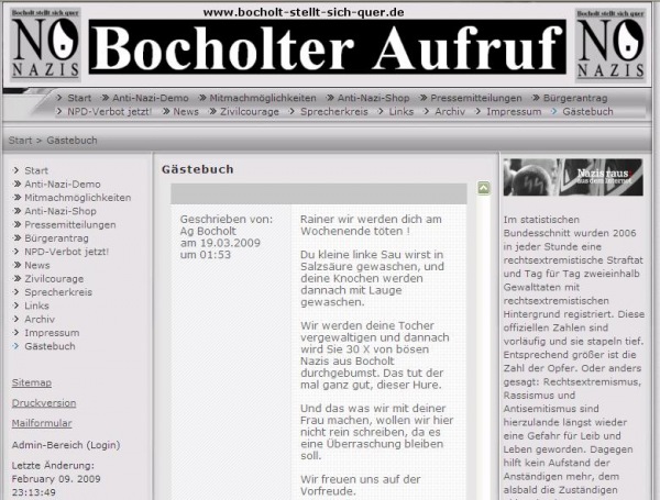 „Du kleine linke Sau wirst in Salzsäure gewaschen, und deine Knochen werden danach mit Lauge gewaschen“, so lautet ein Auszug aus dem Gästebucheintrag, der in der vergangenen Nacht auf der Internetseite der Bürgerinitiative „No Nazis – Bocholt stellt sich quer“ erschienen ist. Geschrieben hat ihn die Aktionsgruppe Bocholt, eine Organisation, zu der nach eigenen Angaben 120 Personen zählen.