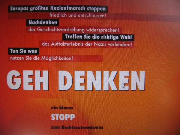 Seit einigen Jahren haben vielfältige Aktivitäten gegen den rechtsextremen Aufmarsch in Dresden Tradition. Im Jahr 2006 konnte dieser gemeinsam und friedlich blockiert werden. In den Jahren 2007 und 2008 wurden die rechtsextremen Demonstrationen erheblich gestört. An den Erfolgen einer aktiven zivilgesellschaftlichen Mobilisierung der vergangenen Jahre wollen wir 2009 anknüpfen und rufen bundesweit dazu auf, die Rechtsextremisten friedlich und entschlossen in Dresden zu stoppen."'