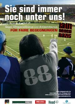 Mit einer neuen Plakataktion will die Hamburger Kampagne "lautgegennazis" auf die kontinuierliche Unterwanderung der Fußballfanszene durch Neonazis aufmerksam machen. "Sie sind immer noch unter uns" soll als Aufforderung gelten, erkennbare Rechtsextreme im Publikum direkt anzusprechen oder zu melden.