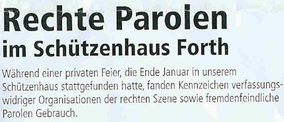 Wir bekamen die Anzeige von einem MUT-Leser aus Nürnberg zugeschickt. Er mailte dazu: "Die beigefügte Anzeige eines ländlichen Schützenvereins (!!) Forth im Landkreis Erlanger-Land habe ich dem örtlichen Anzeigenmagazin (Eckentaler Wochenblatt), das in alle Haushalte verteilt wird, entnommen. Zwar unspektakulär, aber sehr bemerkenswert....Ein gutes Beispiel auch dafür, dass engagierte zivilgesellschaftliche Arbeit in der Region mit Unterstützung der Medien ein Klima gestalten kann, in der die Beheimatung von Neonazis unter die Rubrik "unanständig" fällt. Man darf noch hoffen!"